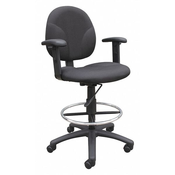 Drafting Chair, Adjustable Arms Yes, Overall Width 25 in, Overall Depth 25 in, Maximum Seat Height 31 1/2 in, Maximum Overall Height 49 1/2 in, Seat Color Black, Frame Color Black, Seat Thickness 2 in, Back Color Black, Seat Depth 18 in, Seat Width 20 in, Seat Material Fabric, Back Material Fabric, Frame Material Nylon, Number of Arms 2, Weight Capacity 275 lb, Tilt Configuration Not Applicable, Style Classification Executive, Minimum Seat Height 26 1/2 in, Notional Size Standard