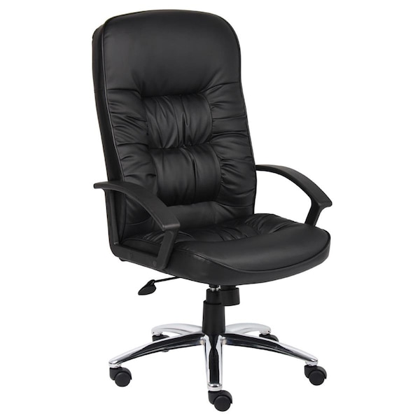 Beautifully upholstered in black LeatherPlus. LeatherPlus is leather that is polyurethane infused for added softness and durability. Executive High Back styling with extra lumbar support . Extra thick seat and back cushion. Pneumatic gas lift provides instant seat height adjustment. Adjustable tilt tension control. Upright locking control. Durable polypropylene armrests. Large 27 chrome base for greater stability. Hooded double wheel casters.Matching guest chair with cantilever base B7309. High back model B7302 Mid back model B7307>-Seat Size: 21W x 20D-Seat Height: 20-23.5H-Arm Height: 25.5-29H-Overall Size: 27W x 28.5D x 45.5-49H-Weight Capacity: 250