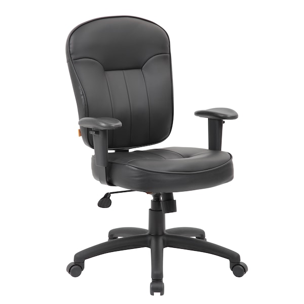 This mid back leather task chair with extra large seat and back cushions makes for a comfortable seat during extended periods of work. The beautifully upholstered Black LeatherPlus (leather and polyurethane) provides extra added softness and durability. It comes equipped with height adjustable polypropylene arms. The large 27-inch black nylon base provides added stability to the chair. The hooded double wheel casters make it easy to move and shift directions.