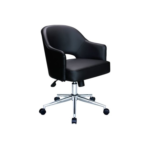 The task chair in black is an exceptionally designed chair with vinyl fixed arms and a breathable semi-open back in vinyl as well. It is understated and sleek and it also offers useful, functional features such as tilt tension, a pneumatic gas lift for easy height adjustments and an upright lock. The chair boasts a sturdy 25 inch chrome base with hooded dual wheel castors for a smooth roll and has a weight limit of 275 lbs.