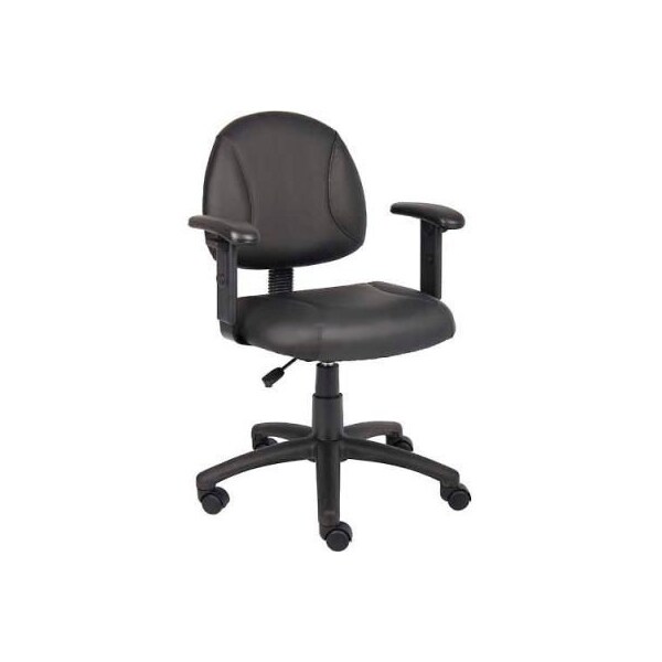 Boss black posture chair with adjustable arms beautifully upholstered in leatherplus. Leatherplus is leather that has been infused with polyurethane for added softness and durability. Thick padded seat and back with built-in lumbar support. Waterfall seat reduces stress to your legs. Adjustable depth back. Pneumatic seat height adjustment. 5 star nylon base allows smooth movement and stability. Hooded double wheel casters. With adjustable arms.