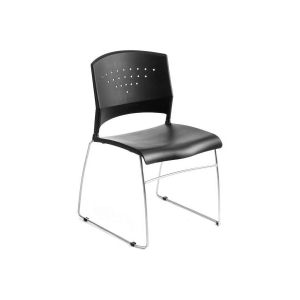 Black stack chair with chrome frame economical stack chair provides superior durability and lumbar support. Black polypropylene seat and back. Solid chrome frame. An opening integrated in the sculpted seat back allows for ease of movement and stacking. May be stacked 16 high on dolly .