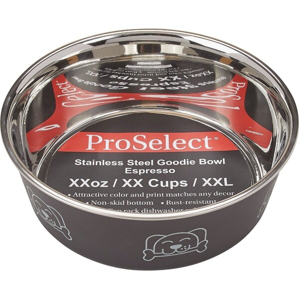 ProSelect Stainless Steel Goodie Bowl features a polished poly resin exterior non-skid bottom and stainless steel bowl. Attractive color and dog print matches any decor. Skid-resistant to keep eating area tidy clean. Stainless steel bowl is super easy to clean dishwasher-safe and nonporous. Wont hold on to any harmful bacteria. Stainless steel bowls are extremely durable and unbreakable. Top rack dishwasher safe for easy cleaning.