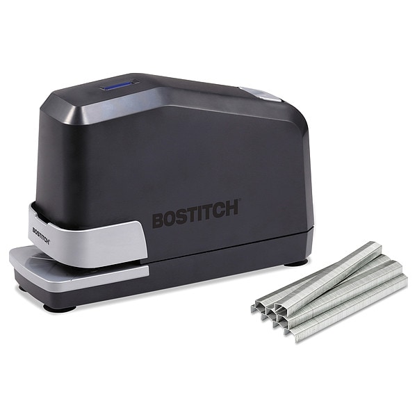 Electric Stapler, Sheet Capacity 45, Throat Depth 1/2 in, Color Black, Length 4 in, Width 9 in, Height 6 3/4 in, Staple Capacity 210, Cord Length 6 ft, Material Metal, Plastic, Features Impulse Drive(TM) for 3x Faster Stapling, No-Jam(TM) Technology Eliminates Staple Jams, Refill Alert Light Indicates Low Staple Supply, Stress-Free Fastload(TM) Push-Button Staple Reload, Suction Cup Feet for Extra Stability, Front Loading, For Use With 1/4 in B8 Powercrown Staples