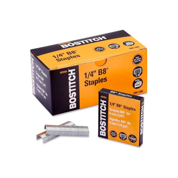 Stanley bostitch b8 powercrown staples, 30 sheet capacity, 1/4" leg length, 10000/box b8 powercrown staples are crafted for ultimate drive performance and designed for use in bostitch b8e, b8e-value, b8hc, b8hdp, b8r, b8p (02245), b8rc-fc, b8rc-2g, b8rc, and b8rcb. As this crowned (peaked) staple top is flattened during the staple drive, it forces the staple legs outward so they are more fully supported by the stapler magazine throughout the drive. This delivers more stapling force and reduced buckling for maximum penetration. Staples are constructed from superior quality, high carbon wire to reduce buckling and jamming. The finely honed chisel points deliver maximum penetration for maximum sheet capacity with a 1/4" leg length.