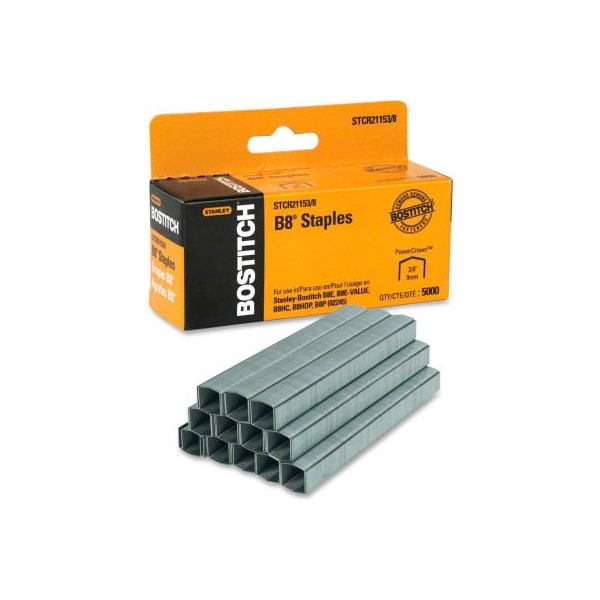 Stanley bostitch b8 powercrown staples, 45 sheet capacity, 3/8" leg length, 5000/box premium powercrown staples are crafted for ultimate drive performance for use in the bostitch b8e, b8e-value, b8hc, b8hdp, and 02245. As this crowned (peaked) staple top is flattened during the staple drive, it forces the staple legs outward so they are more fully supported by the stapler magazine throughout the drive. This delivers more stapling force and reduced buckling for maximum penetration. Each full strip contains 210 staples and is constructed from superior quality, high carbon wire to reduce buckling and jamming. Finely honed chisel points deliver maximum penetration for maximum sheet capacity. Staples with 3/8" leg length fastens up to 45 sheets of paper, light corrugate, fiber board, plastic and other light packaging materials. larger quantity quotes available. Please call 1-888-978-7759. this product arrives to most customers in 2-3 business days.