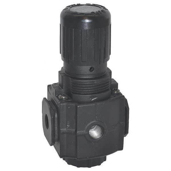 Compressed Air Regulator, Air Inlet Size 1/4 in, Air Inlet Type NPT, Maximum Flow Rate 144 cfm, Maximum Operating Pressure 300 psi, Maximum Operating Temperature 175 Degrees F, Pressure Gauge Included No, Overall Width 2 7/16 in, Adjustment Mechanism Material Brass, Air Inlet Gender Female, Air Outlet Gender Female, Air Outlet Size 1/4 in, Air Outlet Type NPT, Body Material Aluminum, For Fluid Type Compressed Air, For Substance Type Air, Maximum Regulated Pressure 100 psi