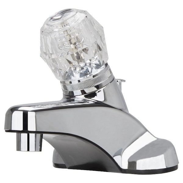 4 in centers. Single acrylic round handle, durable plastic construction, solid brass waterways, 1/2 in NPSM inlet. IAMOP & NSF certified. Carded.