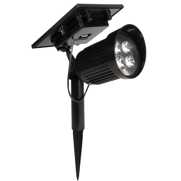 High power, solar spotlight features 200 lumens Plastic construction Black color Batteries included