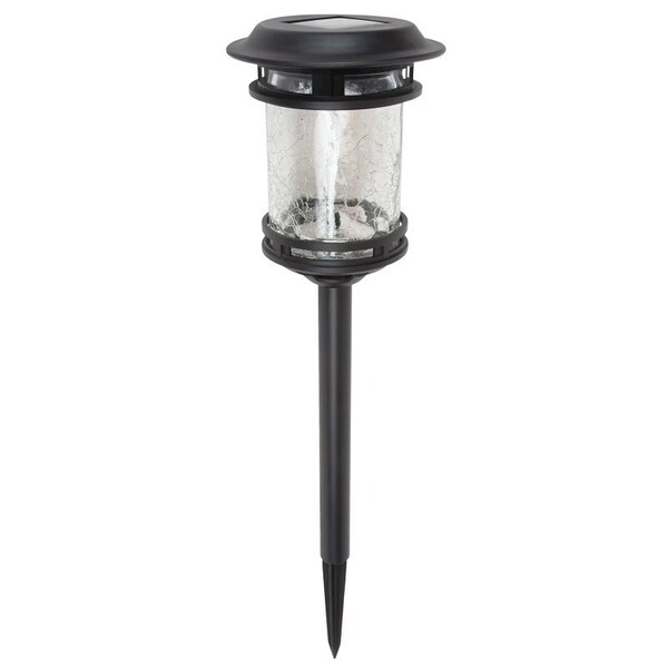 Solar stake light features crackle glass and 10 lumens Plastic and glass construction Black color Batteries included