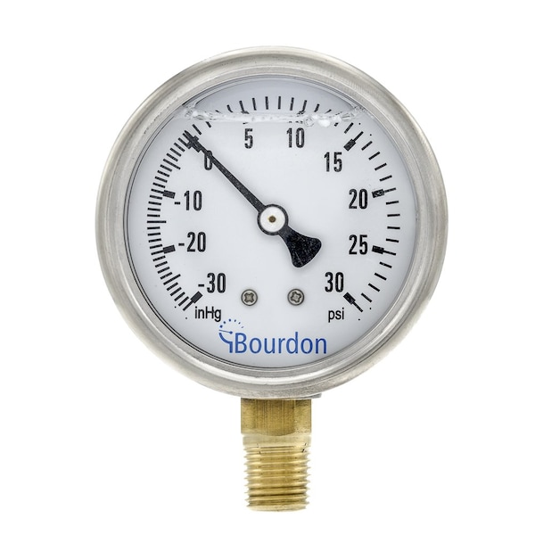 2.5 in. DIAL, -30HG-15 PSI, 1/4 in. NPT LOWER MOUNT, BH1, SS/BR PRESSURE GAUGE