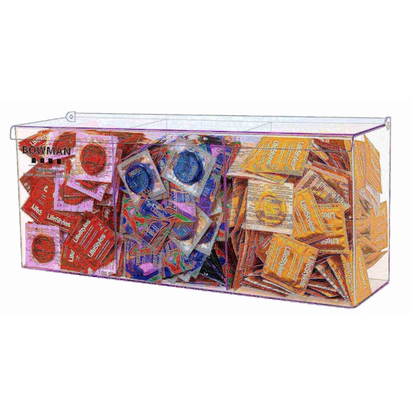 Bulk Dispenser - Mini Triple Bin Holds a variety of small items in bulk Three compartments Top loading and dispensing Hingeless lid Keyholes for wall mounting Clear PETG Plastic