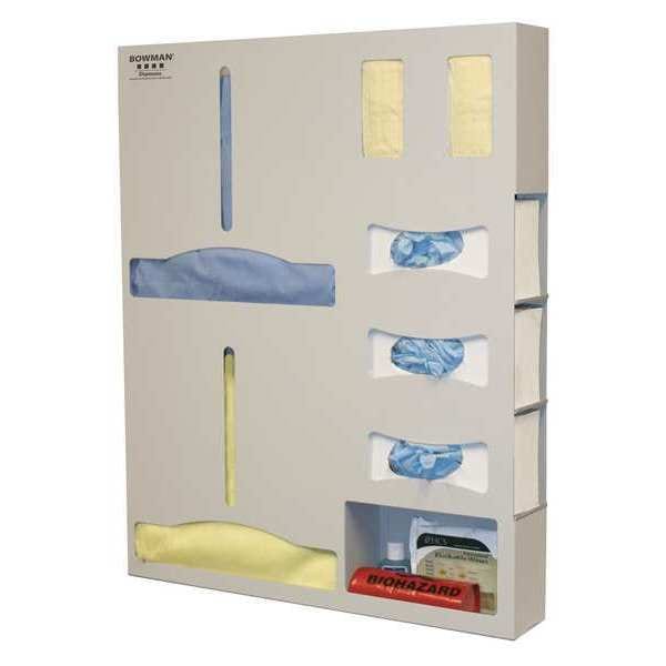 Protection System, Overall Height 30 5/8 in, Overall Width 4 in, Overall Depth 25 in, Number of Compartments 8, Mounting Style Door, Wall, Dispenses Gloves, Gowns, Masks, Miscellaneous Supplies, Material Aluminum, Color Brown