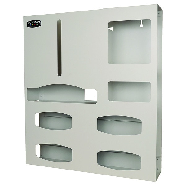 Protection System, Overall Height 25 5/8 in, Overall Width 22 3/4 in, Overall Depth 4 9/16 in, Number of Compartments 7, Mounting Style Door Hanger, Wall, Dispenses Earloop Face Masks, Gloves, Gowns, Shield Face Masks, Material Aluminum, Color Brown, Compartment Size Gown 14-1/2 inW x 14-3/4 inH x 4-9/16 inD, Glove 22-3/4 inW x 5-3/4 inH x 4 inD, Face Shield 8-3/16 inW x 9-5/8 inH x 4-1/4 inD, Face Mask 8-3/16 inW x 5 inH x 4-1/4 inD, Includes Dispenser