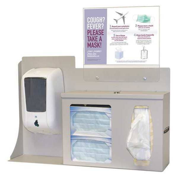 Respiratory Hygiene Station, Overall Height 21 15/16 in, Overall Width 22 1/4 in, Overall Depth 5 in, Number of Compartments 3, Mounting Style Counter, Dispenses Face Masks, Hand Sanitizer, Tissues, Material Plastic, Color Brown, Includes (2) Barrel Screws, (4) Rubber Feet, Respiratory Hygiene Station, Sign Holder