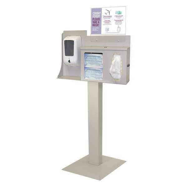 Respiratory Hygiene Station, Overall Height 58 in, Overall Width 22 1/4 in, Overall Depth 18 in, Number of Compartments 3, Mounting Style Floor Stand, Dispenses Face Masks, Hand Sanitizer, Tissues, Material Plastic, Color Brown, Includes (2) Barrel Screws, (8) 10-32 x 5/16 in Phillips Head Screws, Base, Column, Respiratory Hygiene Station, Sign Holder