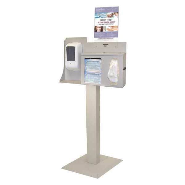 Respiratory Hygiene Station, Overall Height 60 13/16 in, Overall Width 22 1/4 in, Overall Depth 18 in, Number of Compartments 3, Mounting Style Floor Stand, Dispenses Face Masks, Hand Sanitizer, Tissues, Material Plastic, Steel, Color Brown, Includes (2) Barrel Screws, (8) 10-32 x 5/16 in Phillips Head Screws, Base, Column, Respiratory Hygiene Station, Sign Holder