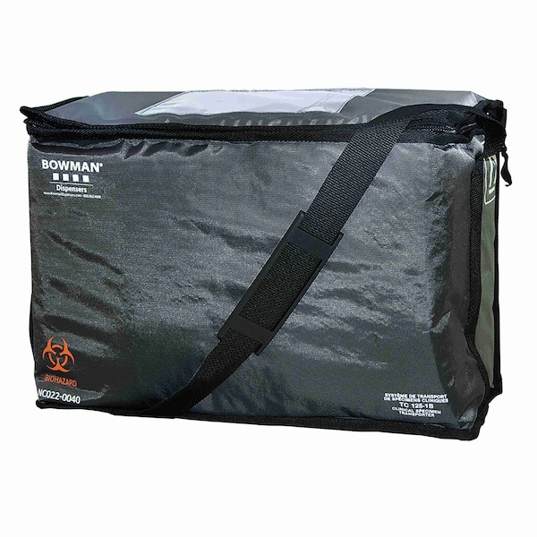 Specimen Transport Tote Large Insulated heavyduty, cleanable PVCcoated nylon Liner wipes clean with 10 bleach solution Safely accommodates ice packs or dry ice Lockable zippers Interior and exterior document pouches and windows Biohazard logo Outer Shell Charcoal PVCcoated 210 Denier Nylon Inner Lining White 210 Denier Nylon