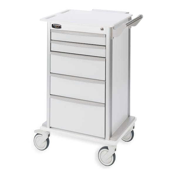 Organize crafts, tools, medical supplies, lab supplies and more with our versatile, locking 5-drawered cart. Lightweight with easy and comforable maneuvering. Pullout supplementary work surface. Industry-recognized 5" locking casters for quality and durability. Constructed of Aluminum Composite Material (ACM) and High Density Polyethylene.