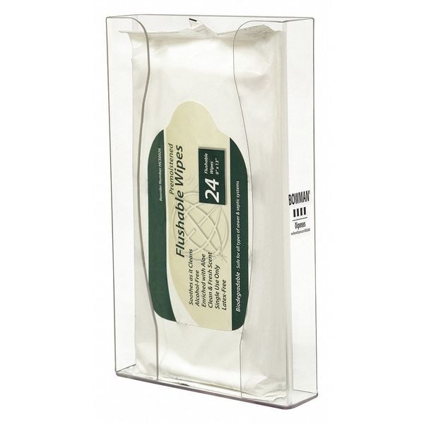 Wipe Dispenser, Overall Height 10 3/8 in, Overall Width 6 3/16 in, Overall Depth 1 7/16 in, Number of Compartments 1, Mounting Style Wall, Dispenses Personal Wipes, Material Plastic, Color Clear, Compartment Size 6 in W x 1 in H x 1-1/4 in D, Includes Dispenser