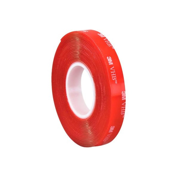 3m 4910 double sided vhb acrylic foam tape 1/2" x 5 yds. 40 mil clear - 1 roll super strong vhb tape provide the simplicity of a tape fastener with incredible strength that in many situations, replaces rivets, bolts, screws, spot welds, liquid adhesives and other permanent fasteners. use to seal skylight inner/outer dome; mount back lit translucent signs or edge-bond resin filled glass use for clear or colorless applications recommended for glass and acrylics moisture, solvent and uv resistant temperature range -40 to 200 f red polyethylene film liner, clear acrylic with an acrylic adhesive