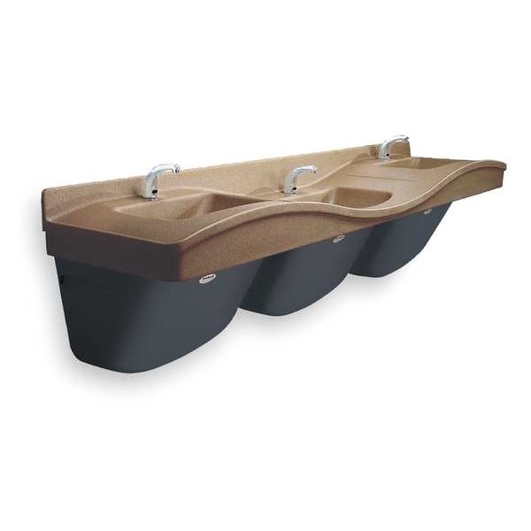 Lavatory System, High On Left And Right, Material of Construction Terreon(R)Solid Surface, Riverstone Color, Capacitive Sensing Operation Type, People Served 3, Operating PSI Range 20-80, Flow Rate 0.5 GPM, Water Connection 1/2 In, Connection Drain 1.5 In, Drain Type Offset Drain, P-Trap, Continuous Waste With End Outlet, Overall Length 92.88 In, Overall Width 29 In, Overall Height 17 In, Basin Height 30-36 In, ADA Compliant, Standards, Includes Battery Operated Faucet