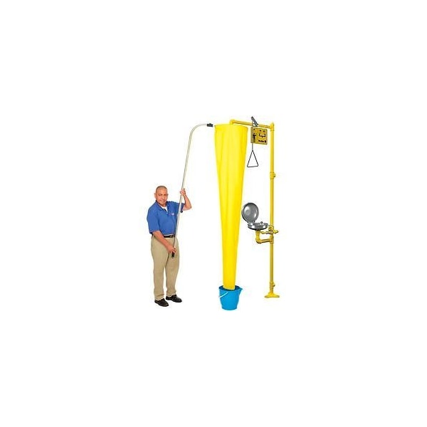 BRADLEY® DRENCH SHOWER TESTER HEAVY-DUTY DRENCH SHOWER TESTER PROVIDES A CONVENIENT WAY TO COMPLY WITH ANSI SPECIFICATIONS FOR WEEKLY TESTING ON ALL DRENCH SHOWERS WITHOUT GETTING WET. A FUNNEL DIRECTS WATER TO A DRAIN OR BUCKET (NOT INCLUDED) AND PREVENTS SPLASHING OF THE SURROUNDING AREA. THE ALUMINUM HANDLE PROVIDED MAKES IT EASY TO POSITION THE FUNNEL UNDER THE SHOWERHEAD.