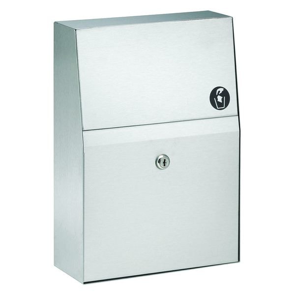 Sanitary Napkin Receptacle, Container Mounting Style Wall-Mounted, Height 15 in, Container Depth 4 in, Width 12 3/4 in, Material Stainless Steel, Shape Rectangular, Color Silver, Lid Type Self-Closing Push Flap, For Use With Mfr. No. P11-024