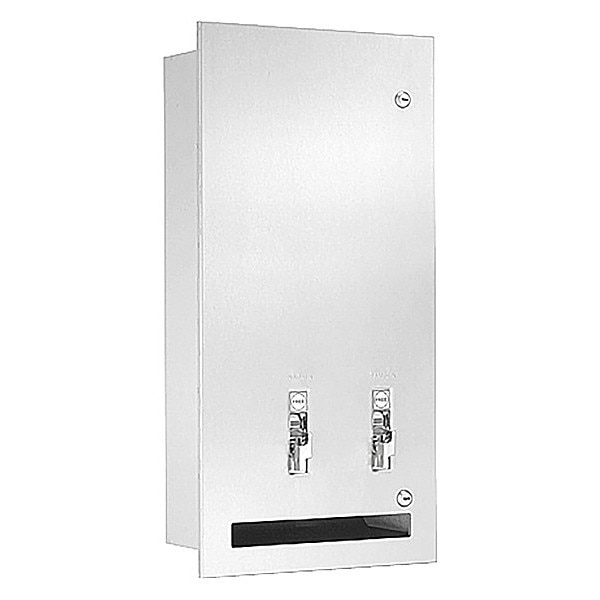 Sanitary Napkin and Tampon Dispenser, Color Silver, Operation Type Single Coin, Material Stainless Steel, Finish Satin, Sanitary Napkin Capacity 30, Includes Not Applicable, Tampon Capacity 28, Overall Height 26 1/8 in, Overall Width 12 1/2 in, Overall Depth 6 1/8 in, Product Type Sanitary Napkin and Tampon Dispenser
