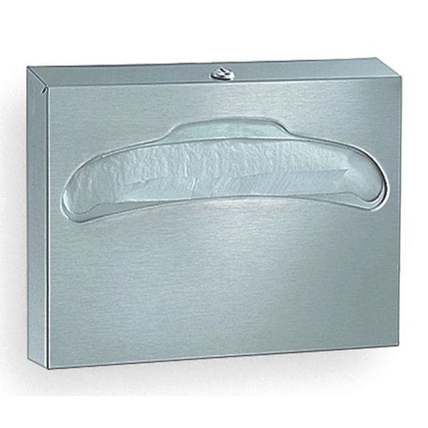 Toilet Seat Cover Dispenser, Fold Type 1/2 Fold, (500) Seat Covers, Silver, Stainless Steel, Dispenser Height 11 1/2 in, Dispenser Width 15 in, Dispenser Depth 2 3/8 in, Product Series No Series, Finish Satin, Dispenser Mounting Surface, ADA Compliance Yes, Compatible Grainger Part Number 2VEX6, Toilet Seat Cover Dispenser