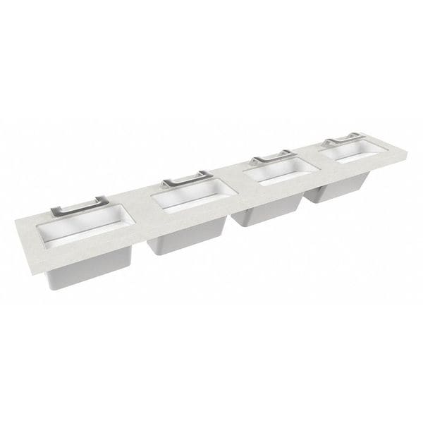Wash Fountain, Four Station Sink, Material of Construction Terreon Solid Surface, Silver Mist Color, Infrared Sensor Operation Type, People Served 4, Operating PSI Range 20 to 80, Flow Rate (GPM) 0.35, Water Connection (In.) 1/2, Connection Drain (In.) 1-1/2, Drain Type P-Trap, Voltage Type 120VAC, Overall Length (In.) 126, Overall Width (In.) 26, Overall Height (In.) 27, Basin Height (In.) 8-1/8, Basin Depth (In.) 11-1/2, ADA Compliant Yes, ADA