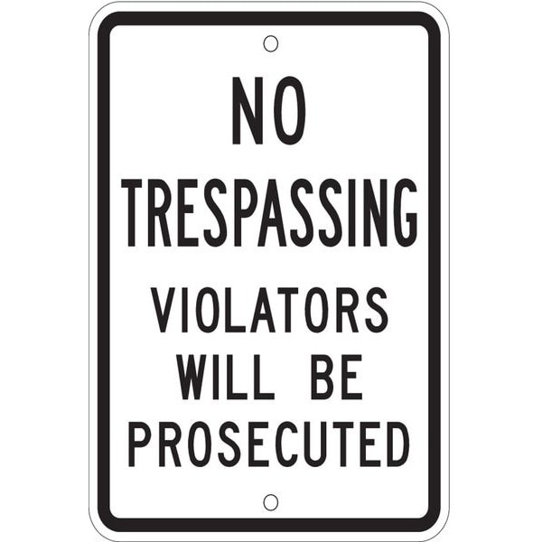 Admittance Sign, Sign Subject Matter Trespassing and Property, Height 18 in, Width 12 in, Sign Material Aluminum, Sign Mounting Style Surface, Header No Header, Legend No Trespassing Violators Will Be Prosecuted, Printed Language English, Sign Shape Rectangle