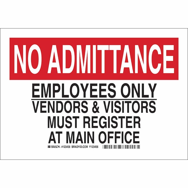 Admittance Sign, Sign Subject Matter Employees and Visitors, Height 7 in, Width 10 in, Sign Material Polyester, Sign Mounting Style Adhesive Surface, Header No Admittance, Legend No Admittance Employees Only Vendors and Visitors Must Register At Main Office, Printed Language English, Sign Shape Rectangle