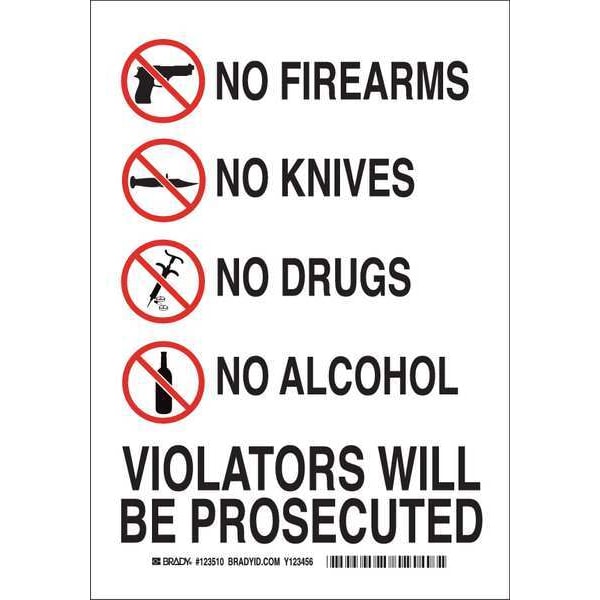Admittance Sign, Sign Subject Matter Weapons, Devices or Substances, Height 10 in, Width 7 in, Sign Material Plastic, Sign Mounting Style With Mounting Holes, Header No Header, Legend No Firearms No Knives No Drugs No Alcohol Violators Will Be Prosecuted, Printed Language English, Sign Shape Rectangle