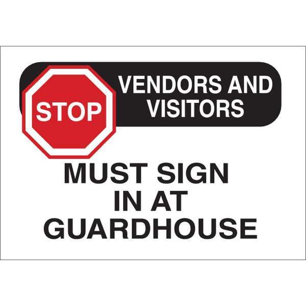 Admittance Sign, Sign Subject Matter Employees and Visitors, Height 10 in, Width 14 in, Sign Material Plastic, Sign Mounting Style With Mounting Holes, Header Stop, Legend Vendors And Visitors Must Sign in At Guardhouse, Printed Language English, Sign Shape Rectangle