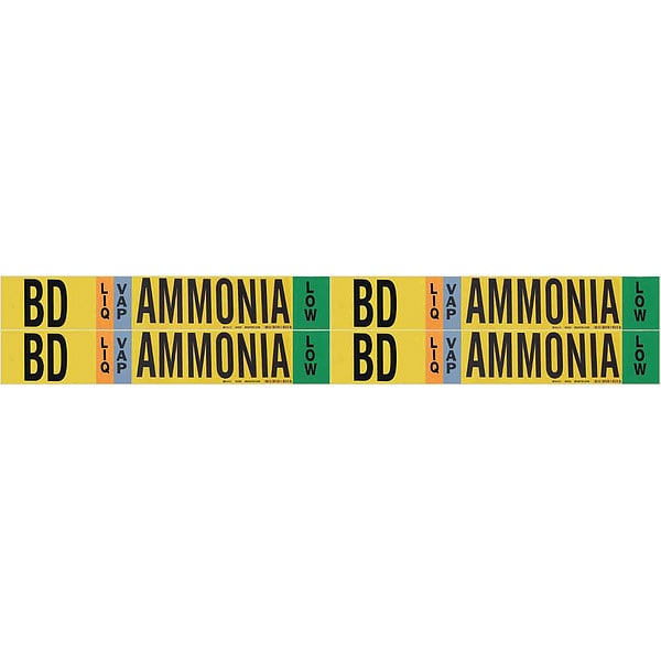 Pipe Marker, Pipe Marker Mounting Style Adhesive Pipe Marker, Pipe Marker Legend Ammonia, Legend Text Color Black, Blue, Green, White, IIAR System Abbreviation BD, IIAR Phase VAP, IIAR Pressure Level Low, Character Height 3/4 in, Background Color Yellow, With or Without Arrows Without