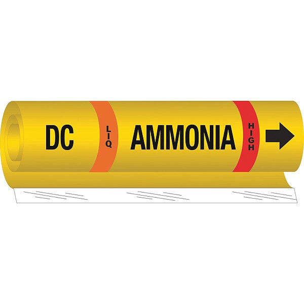 Pipe Marker, Pipe Marker Mounting Style Wrap-Around Pipe Marker, Pipe Marker Legend Ammonia, Legend Text Color Black, Orange, Red, White, IIAR System Abbreviation DC, IIAR Phase LIQ, IIAR Pressure Level High, Character Height 1 1/4 in, Background Color Yellow, With or Without Arrows With