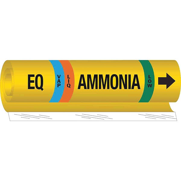 Pipe Marker, Pipe Marker Mounting Style Wrap-Around Pipe Marker, Pipe Marker Legend Ammonia, Legend Text Color Black, Blue, Green, Orange, White, IIAR System Abbreviation EQ, IIAR Phase LIQ/VAP, IIAR Pressure Level Low, Character Height 3/4 in, Background Color Yellow, With or Without Arrows With