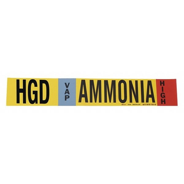 Pipe Marker, Pipe Marker Mounting Style Wrap-Around Pipe Marker, Pipe Marker Legend Ammonia, Legend Text Color Black, Blue, Red, White, IIAR System Abbreviation HGD, IIAR Phase VAP, IIAR Pressure Level High, Character Height 1 1/4 in, Background Color Yellow, With or Without Arrows With