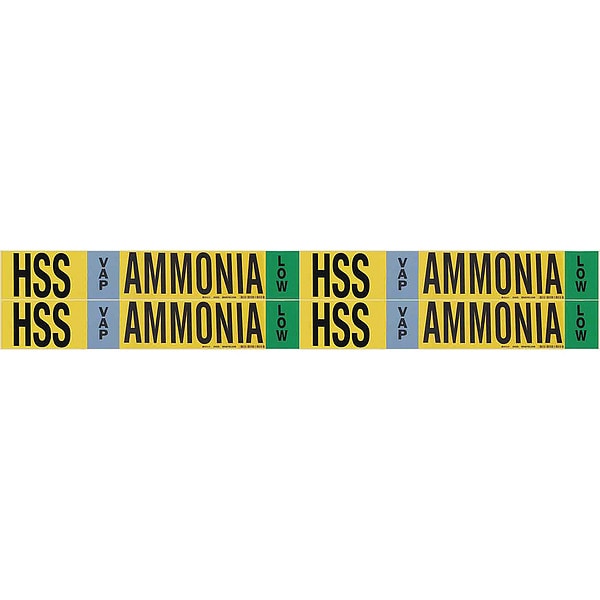 Pipe Marker, Pipe Marker Mounting Style Adhesive Pipe Marker, Pipe Marker Legend Ammonia, Legend Text Color Black, Blue, Green, White, IIAR System Abbreviation HSS, IIAR Phase VAP, IIAR Pressure Level Low, Character Height 3/4 in, Background Color Yellow, With or Without Arrows Without