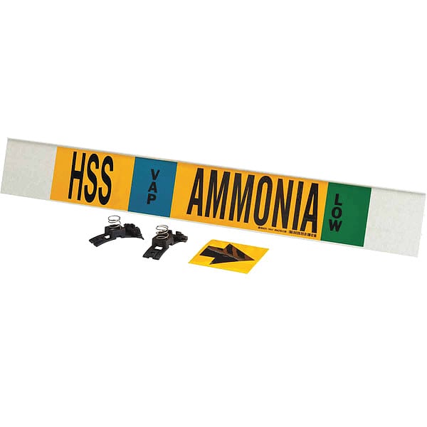 Pipe Marker, Pipe Marker Mounting Style Fiberglass Carrier with Strapping and Mounting Clip Pipe Markers, Pipe Marker Legend Ammonia, Legend Text Color Black, Blue, Green, White, IIAR System Abbreviation HSS, IIAR Phase VAP, IIAR Pressure Level Low, Character Height 3 1/2 in, Background Color Yellow, With or Without Arrows With