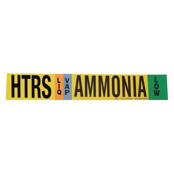 Pipe Marker, Pipe Marker Mounting Style Adhesive Pipe Marker, Pipe Marker Legend Ammonia, Legend Text Color Black, Blue, Green, White, IIAR System Abbreviation HTRS, IIAR Phase LIQ/VAP, IIAR Pressure Level Low, Character Height 2 in, Background Color Blue, Green, Orange, Yellow, With or Without Arrows Without