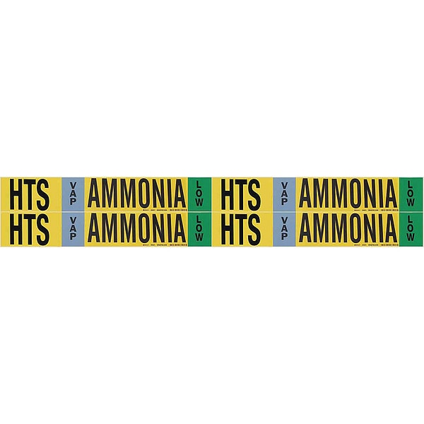 Pipe Marker, Pipe Marker Mounting Style Adhesive Pipe Marker, Pipe Marker Legend Ammonia, Legend Text Color Black, Blue, Green, White, IIAR System Abbreviation HTS, IIAR Phase VAP, IIAR Pressure Level Low, Background Color Yellow, With or Without Arrows Without