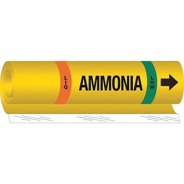 Pipe Marker, Pipe Marker Mounting Style Wrap-Around Pipe Marker, Pipe Marker Legend Ammonia, Legend Text Color Black, Green, Orange, White, IIAR System Abbreviation (Blank), IIAR Phase LIQ, IIAR Pressure Level Low, Character Height 1 1/4 in, Background Color Yellow, With or Without Arrows With