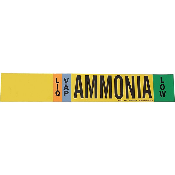 Pipe Marker, Pipe Marker Mounting Style Adhesive Pipe Marker, Pipe Marker Legend Ammonia, Legend Text Color Black, Blue, Green, Orange, White, IIAR System Abbreviation (Blank), IIAR Phase LIQ/VAP, IIAR Pressure Level Low, Background Color Yellow, With or Without Arrows Without