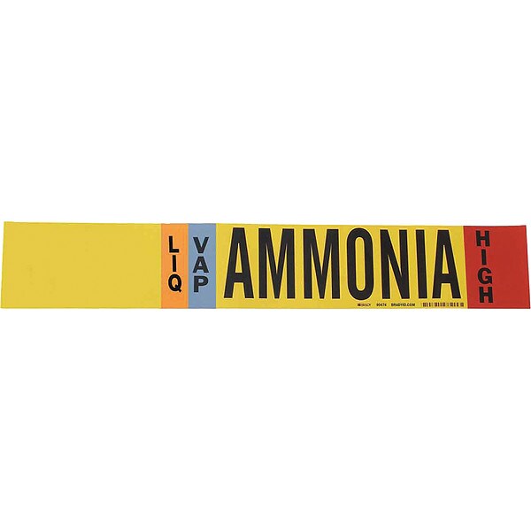 Pipe Marker, Pipe Marker Mounting Style Adhesive Pipe Marker, Pipe Marker Legend Ammonia, Legend Text Color Black, Blue, Orange, Red, White, IIAR System Abbreviation (Blank), IIAR Phase LIQ/VAP, IIAR Pressure Level High, Character Height 3 1/2 in, Background Color Yellow, With or Without Arrows Without