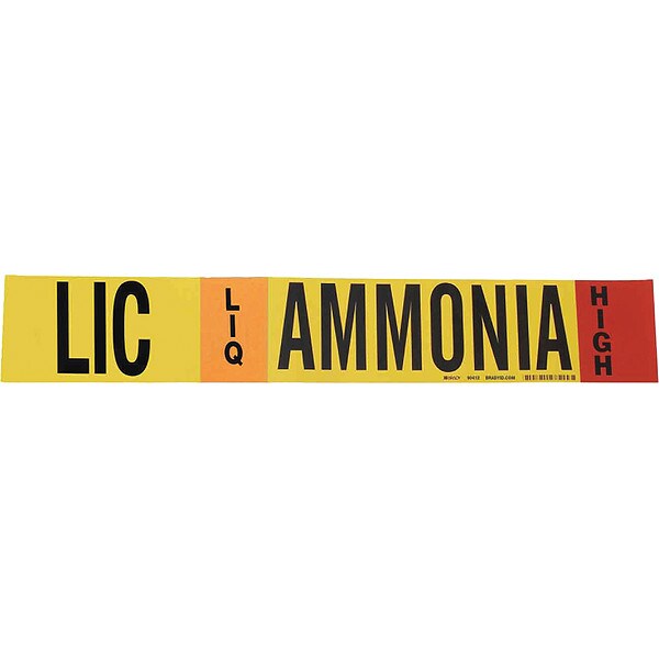 Pipe Marker, Pipe Marker Mounting Style Adhesive Pipe Marker, Pipe Marker Legend Ammonia, Legend Text Color Black, Orange, Red, White, IIAR System Abbreviation LIC, IIAR Phase LIQ, IIAR Pressure Level High, Background Color Yellow, With or Without Arrows Without