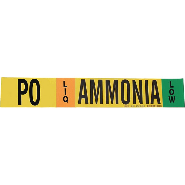 Pipe Marker, Pipe Marker Mounting Style Adhesive Pipe Marker, Pipe Marker Legend Ammonia, Legend Text Color Black, Green, Orange, White, IIAR System Abbreviation PO, IIAR Phase LIQ, IIAR Pressure Level Low, Character Height 3 1/2 in, Background Color Yellow, With or Without Arrows Without
