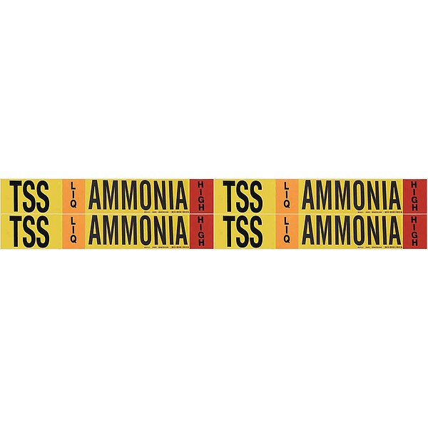 Pipe Marker, Pipe Marker Mounting Style Adhesive Pipe Marker, Pipe Marker Legend Ammonia, Legend Text Color Black, Orange, Red, White, IIAR System Abbreviation TSS, IIAR Phase LIQ, IIAR Pressure Level High, Background Color Yellow, With or Without Arrows Without