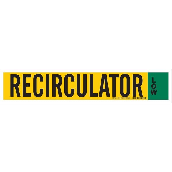 Ammonia Pipe Markers, Pipe Marker Mounting Style Adhesive Pipe Marker, Pipe Marker Legend Recirculator Low, Legend Text Color Black, IIAR System Abbreviation (Blank), Background Color Green, Yellow, With or Without Arrows Without
